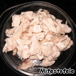 Когда куриное мясо остынет, очищаем его от костей, режем на мелкие кусочки.