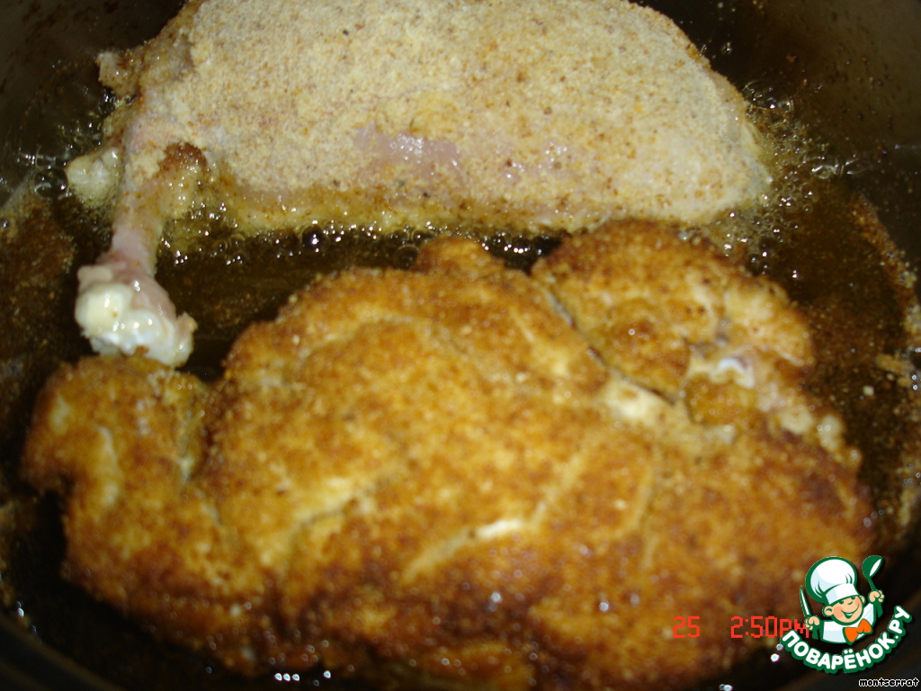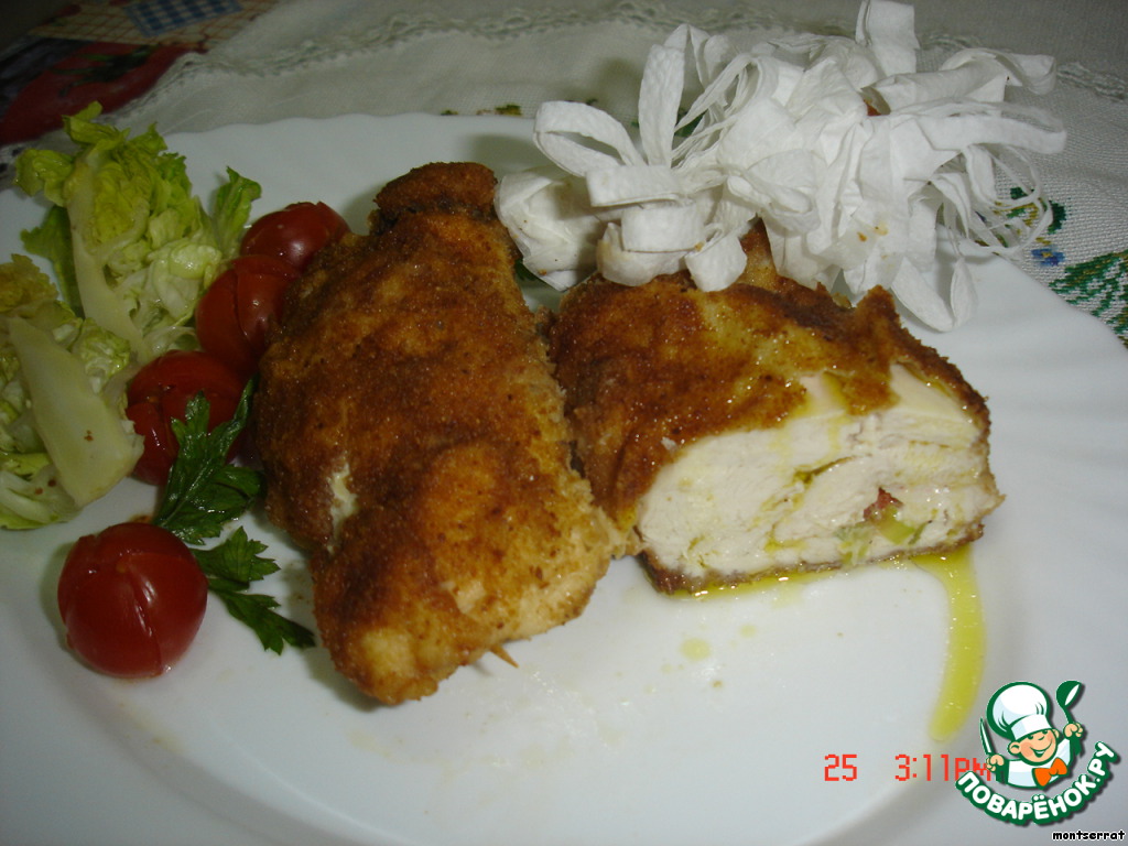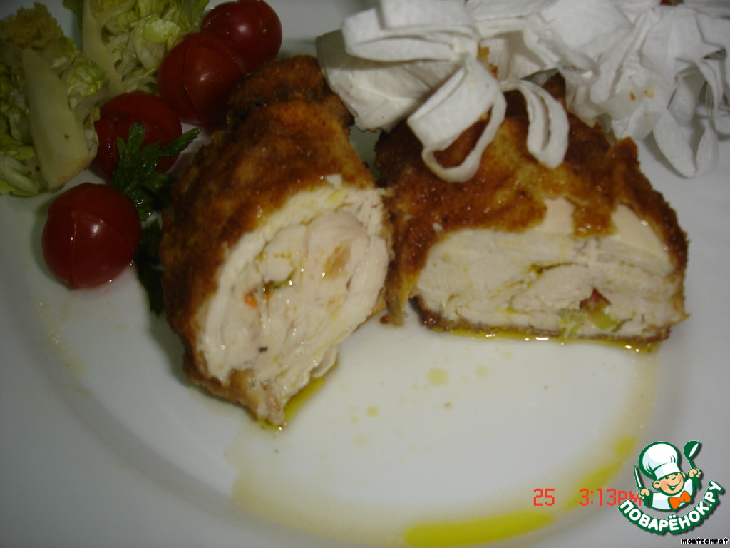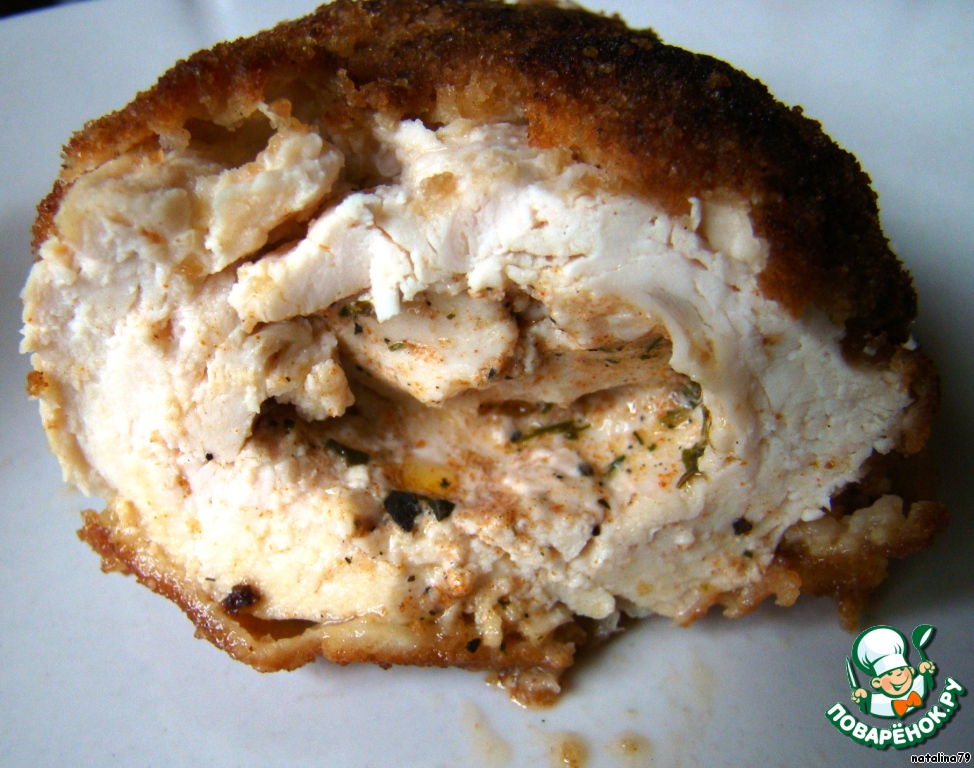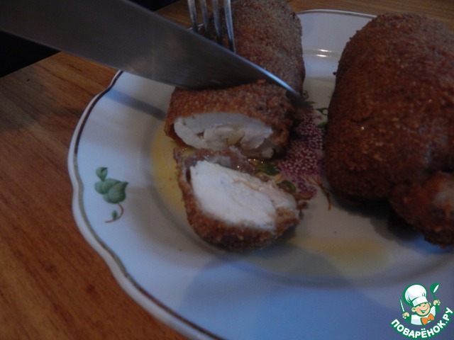 Если котлета сделана правильно, растопленное масло должно вытекать при разрезании. Благодаря ему грудка получается сочная, очень вкусная.