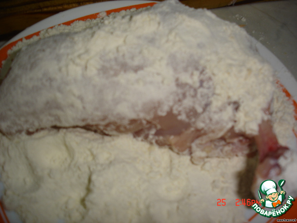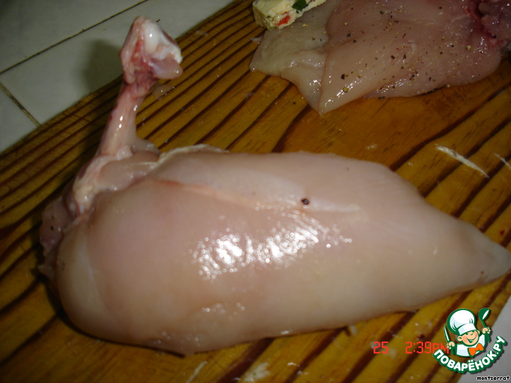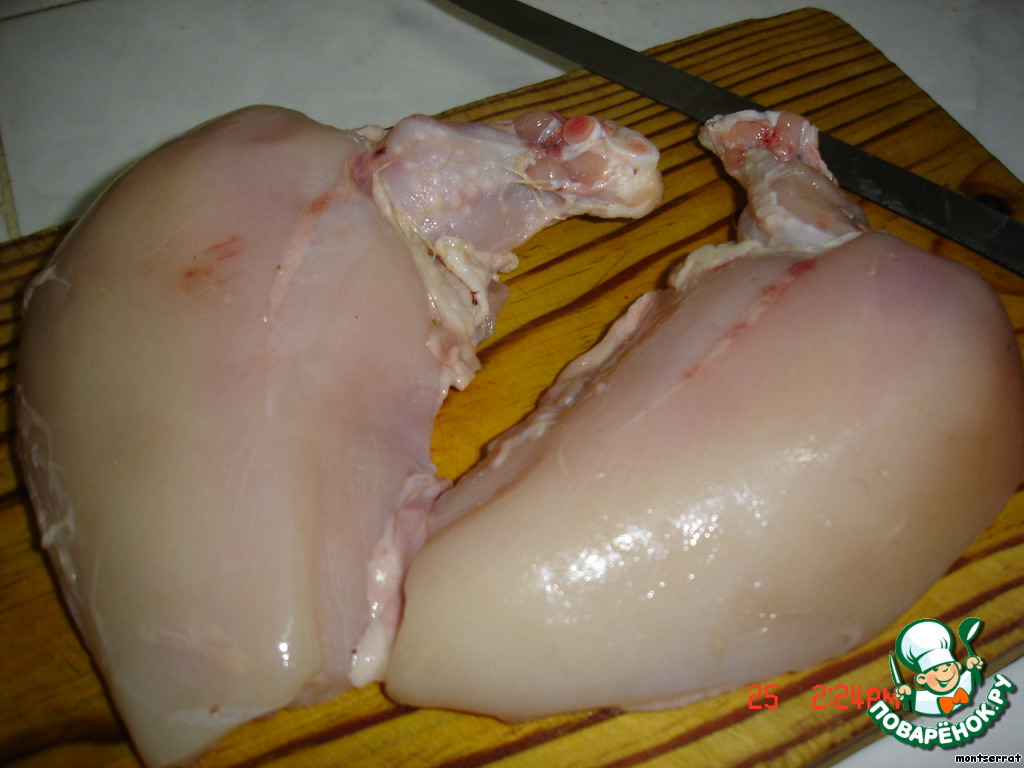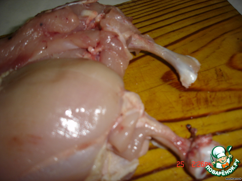 Наиболее ответственный момент - правильно подготовить полуфабрикат: с тушки в области грудки снимаем кожу, срезаем грудку с двух сторон тушки вместе с крылышком.