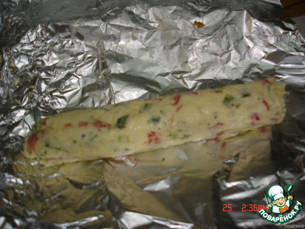 Накануне подготовим масло для фарширования грудки: размягченное масло смешаем с рубленой зеленью, солью и соком лимона, завернем в фольгу и оставим в холодильнике до полного застывания.