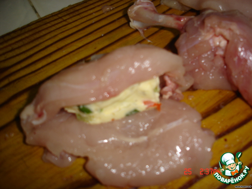 Поместить внутрь надрезанного большого филе, опять хорошо завернуть,