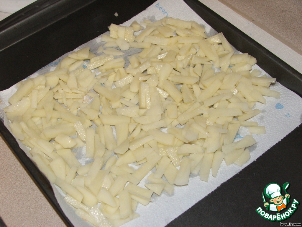 Чистим картофель, мелко нарезаем и заливаем холодной водой на 5 минут.