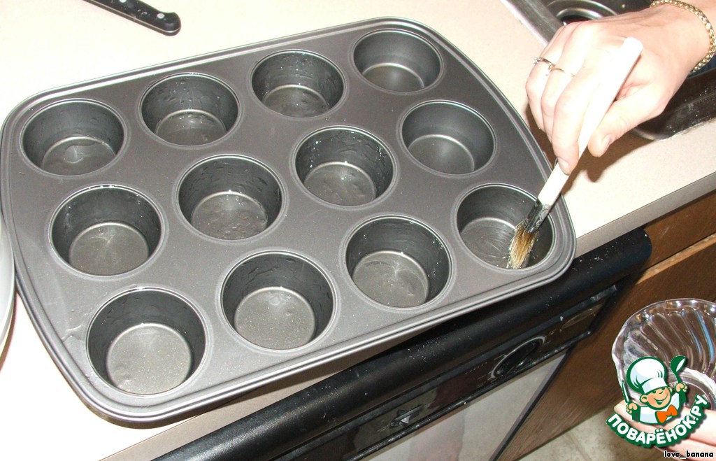 Выкладываем получившуюся смесь в форму, делаем углубления в центре каждой формочки. Отправляем в духовку на 15 минут при 200 С