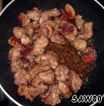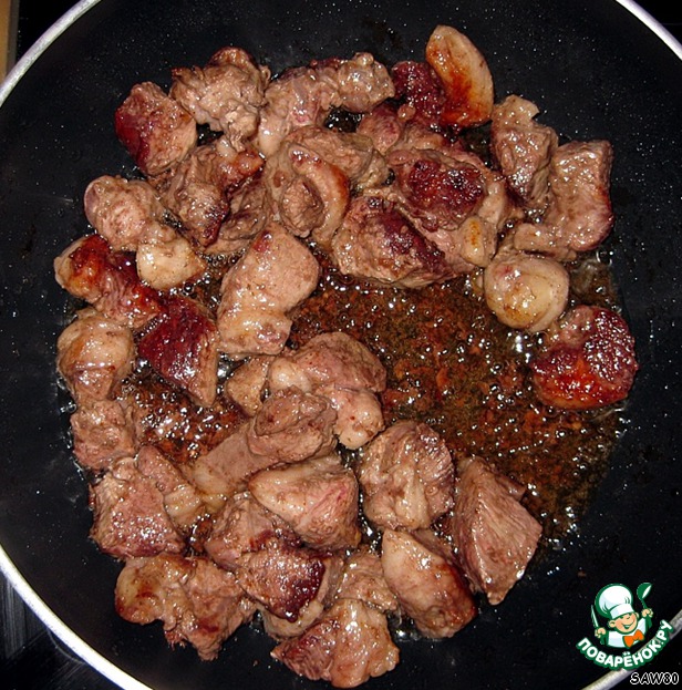 Мясо нарезать кубиками и обжарить до золотистого цвета на большом огне.