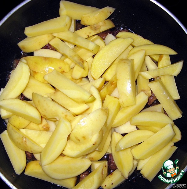 В это время нарезать картофель ломтиками, добавить в сковороду, чуть подсолить.