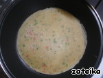 Сковороду разогреваем, добавляем в тесто 1 столовую ложку масла, еще раз как следует вымешиваем и начинаем печь блинчики. Как это ни странно, тесто удобно наливать на сковороду столовой ложкой (сначала попробовала по привычке половником - оказалось неудобно: тесто гуще, чем блинное, растекается медленно, получается очень толстый блин) – несколько ложек теста быстро наливаем в сковороду и так же быстро распределяем (размазываем) тыльной стороной ложки по спирали от центра к краям. У меня диаметр сковороды ок. 16 см., я наливала по 3 ложки.