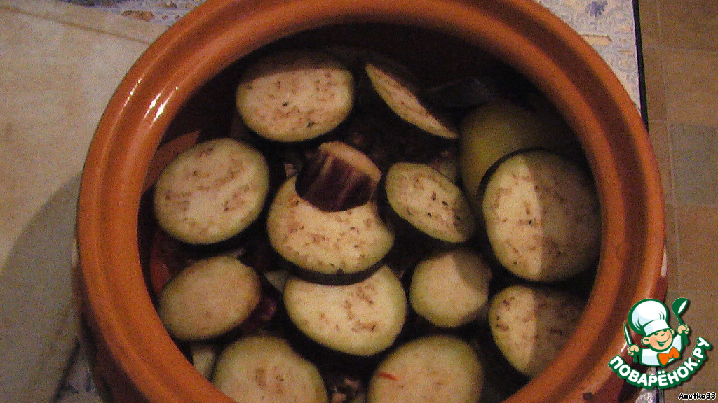 • Смазываем стенки горшочка маслом, выкладываем фаршированные овощи на дно горшка, затем на овощи кружки баклажана.