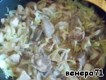 обжарить. Добавить отварные грибы и жарить минут пять. -