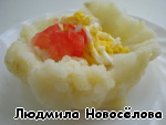 из картофеля сделать лепёшку, приподнять края, на середину выложить салатик