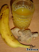 Наливаем апельсиновый сок в блендер, добавляем измельченный имбирь, очищенный банан.