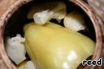 Перец уложить в горшочек. Я положила по одному перцу. Рядом с ним - оставшуюся цветную капусту