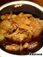 На дно кладем кусочек сливочного масла, а на него - слой лука. -
