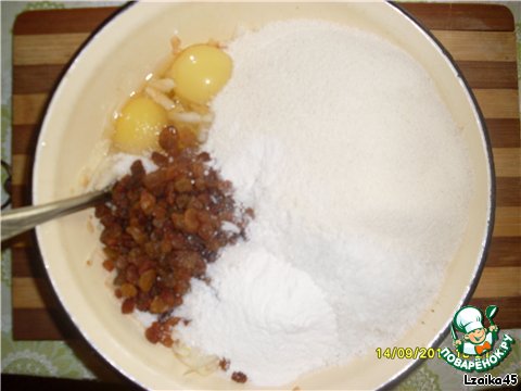 В натёртые яблоки добавить всё остальное: яйца, стружку, изюм, сахар, манку, ванилин, соль, разрыхлитель.