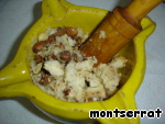 Начинаем приготовление соуса: в ступку закладываем подсушенные миндаль, хлеб, соль и толчем до однородной массы.