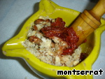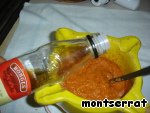 В измельченную массу постепенно добавляем оливковое масло, непрерывно размешивая, чтобы образовалась эмульсия.