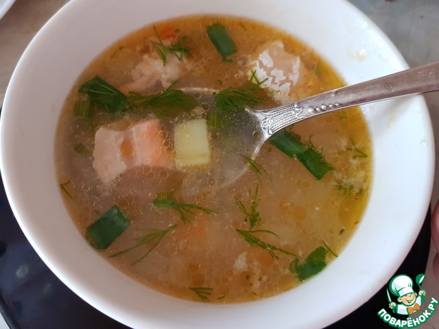 Бульон процеживаем, добавляем в него все овощи, солим по вкусу и варим минут 20, добавляем семгу варим 5 минут.