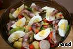 Картофель, листья салата, редис, перец сложить в салатницу и перемешать. Сверху выложить дольки очищенной от костей селедки и яйца. Посыпать салат измельченной зеленью, поперчить, заправить маслом. Приятного аппетита!!!