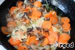 Обжарить на сковороде грибы и морковь, затем добавить к ним репчатый лук. Накрыть крышкой и тушить 5-10 минут. -