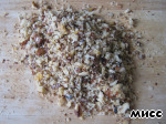 Горячее мясо и "бантики" смешиваем с остальными ингредиентами, заливаем соусом и оставляем пропитаться и остыть. Засыпаем сверху грецкими орехами.