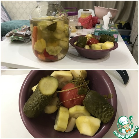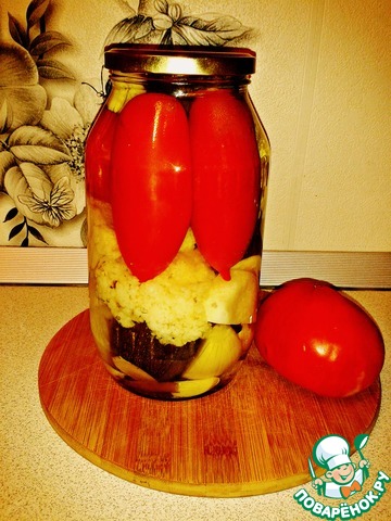 Ассорти получается вкусным, в меру острым... У нас с мужем разные предпочтения в маринованных овощах, так в этой банке можно найти овощи на любой вкус! Очень яркое и аппетитное.. Что мне нравится в этом рецепте, нет необходимости закатывать банки, вполне достаточно винтовых крышек... Количество овощей не указываю, так как все зависит от предпочтений и наличия)))