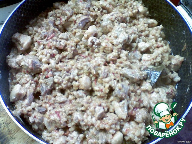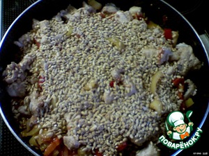 Добавить перловку к мясу с овощами, при необходимости подливать понемногу воды, чтобы не подгорело. -
