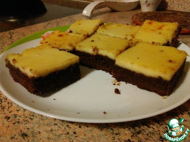 Но в первые разы не всегда удачно верхушка застывала - надо приспособиться. Я добавляю побольше сыра на такое количество сливок (так и заливки побольше выходит, значит, ещё вкуснее будет), а заливаю ею брауни, когда на поверхности он точно не жидкий, застывший - иначе смешивается заливка с шоколадом.