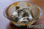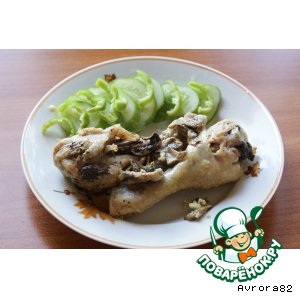 Куриные голени (это могут быть окорочка, чахохбили, крылья, бедра - кому что нравится) моем, по желанию снимаем кожу и складываем в жаропрочную посуду. У меня она вмещает только 4 голени. Туда же выдавливаем чеснок и режем шампиньоны (можно без грибов, тоже ничего). Все это дело солим, приправляем и перемешиваем. Если позволяет время, можно оставить помариноваться.