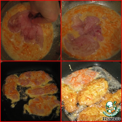 приготовить кляр из яиц + муки + моркови + соль + перец