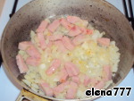 Далее надо разделить ветчину на две части, одну часть нарезать брусочками и обжарить в половине масла вместе с нарезанным луком. В конце жарки выдавить зубчик чеснока и перемешать, закрыть крышкой, снять с огня и отставить в сторону. -