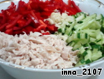 Нарезать огурец и перец соломкой, куриную грудку кусочками или порвать на волокна.