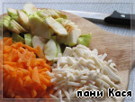 Яблоки очистить от сердцевинки, нарезать ломтиками. Морковь и корень петрушки - соломкой. Лук - кубиками.