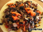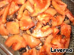 Далее очищенный от кожуры и нарезанный помидор. Ставим в духовой шкаф на 30-40 мин. при 180 градусах.