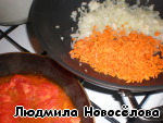 Лук нарезали и обжарили в скороде на растительном масле, как он стал прозрачным, добавили нарезанную мелкими кубиками морковь, продолжаем жарить 5 мин.