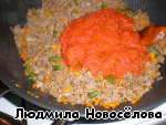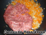 Добавляем фарш и продолжаем обжаривать, постоянно помешивая