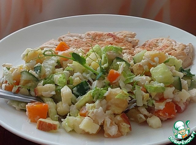 Легкий салат с рыбой и овощами. Особую мягкость и пикантность придает яблоко. Пробуйте, друзья.