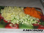 Нарезать кубиками огурец, вареную морковь и картофель.