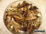 Отварим макароны и зафаршируем подготовленными грибами, охладим и нарежем на кусочки.