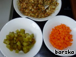 Нарезать кубиками морковь и ещё 1 солёный огурец