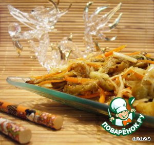 Морковь нарезать узкими полосками (по корейски). Посолить, посыпать сахаром и немного помять.