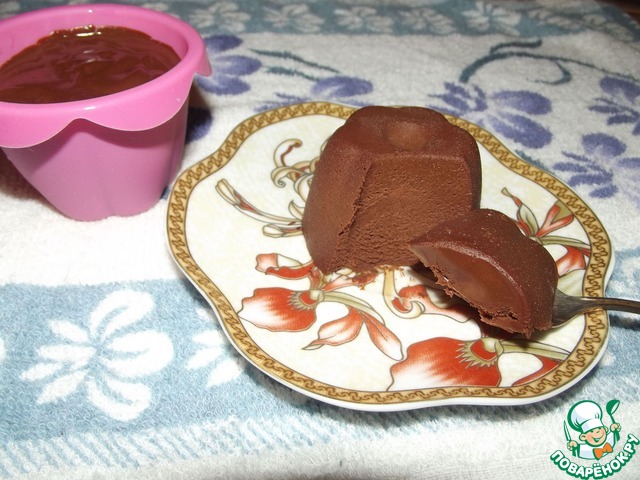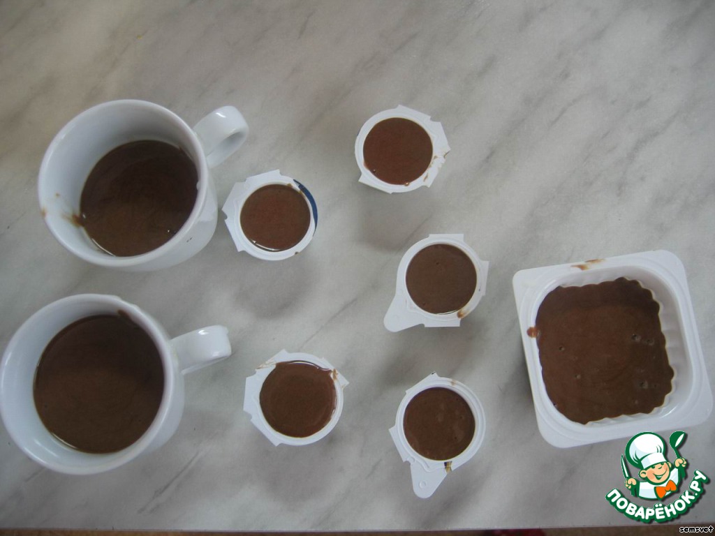 Взять 2-3 невысоких стаканчика. Смазать их изнутри маслом без запаха или выстелить пищевой плёнкой. Разлить шоколадную массу по формочкам. Или разлить в нарядные креманки и в них подавать десерт к столу.