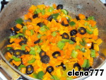 Морковь порезать на маленькие кубики и потушить минут 5 в небольшом количестве воды с добавлением сливочного масла. Затем добавить порезанный кубиками болгарский перец и маслины, порезанные колечками. Немного посолить и тушить ещё минуты 3. Затем вынуть шумовкой на блюдо, слегка отжимая и остудить.