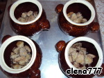 Бока горшочков обмазать растительным маслом и разложить в них обжаренное мясо с луком. У меня получилось 4 горшочка.