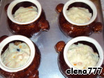 У меня всего четыре горшочка, а гостей было приглашено 12 человек. Пришлось задуматься, как приготовить требуемое кол-во порций? Выручило слоеное не дрожжевое тесто. Вместо формочек сделал мешочки из теста(используя пиалушку), сверху мешочек завязал ленточкой из теста, оставив отверстие диаметром 2 см, сыр туда вылез и закипел.