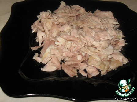 Отварить курицу (у меня 3 шт. голени). Мелко нарезать.