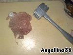Мясо нарезать на кусочки, хорошо отбить с двух сторон. Посолить, поперчить.