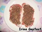 Грибы измельчаем на мясорубке, добавляем туда зелени, солим, перчим и намазываем их затем поверх мяса.