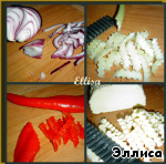 Нарезаем длинными полосками черешки сельдерея, болгарский перец, брынзу, репчатый лук.