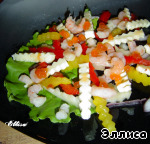 Выкладываем на тарелку листья салата, а на них все подготовленные ингредиенты