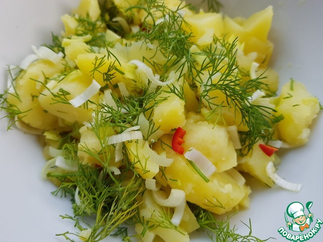Смешать порезанные картофель и зелень - они должны быть в равных пропорциях.
