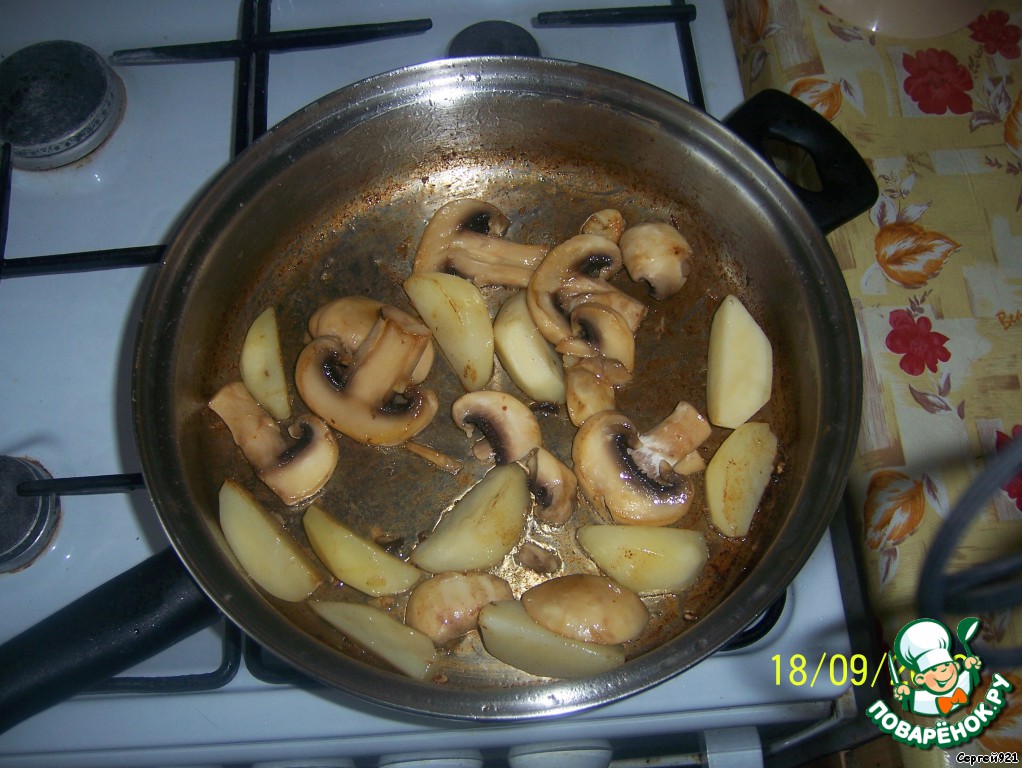 Обжариваем нарезанные дольками картофелины и шампиньоны до слегка золотистого цвета и укладываем слоем поверх мяса.